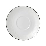 Mikasa 5087064, Parchment Modern porcelain dinnerware features a gentle gray border embellished with a beautifully detailed scroll design. This chic and elegant collection is accented by an outer border of platinum. The saucer protects your table from a teaspoon, as well as holds those tasty treats you like to enjoy with your coffee or tea. 6-1/4-inch diameter. Dishwasher safe, but hand washing recommended. (Read More)